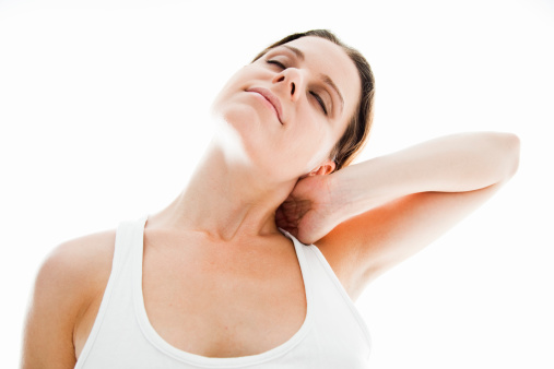 Begin by placing one hand on the base of the neck, stretched across the collar bone. Hold hand down and extend the neck by letting the chin lead while stretching jaw towards upwards. Instead of swallowing, reach bottom lip towards the ceiling like a gulping fish. Make 10 “gulps”.